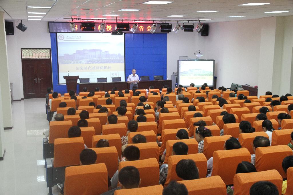 会上,傅教授用通俗幽默的语言,旁征博引,从信息时代的教学变革出发,深刻阐述了教育信息化对教师职业的挑战和所赋予的使命。他认为教师是职业,教学是教师的专业。在目前教师专业性不强的情况下,教师应注重自己在专业道德、专业理念、专业知识技能、专业责任、专业自制和专业团队组织等方面的发展。作为未来的教师,不仅要答疑解惑,要用至诚用心、广博爱心、清静耐心和服务热心去容爱员工,做好奉献,更要做到敬业爱岗、言传身教、教书育人、服务社会、传承和创新文化。最后,傅教授还与公司教职工分享了他参加2009年全国优秀教师颁奖典礼的盛况,他说,国家对教育非常重视,希望大家能把教师当作一项职业来对待。傅教授以其丰富的工作经历,高水平的学术研究,提纲挈领,深入浅出,为公司教职工呈现了一场精彩纷呈的学术报告,让大家领略了国家级教学名师的风采。
