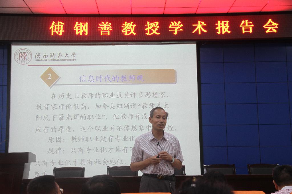 本网讯 6月28日下午,公司邀请国家级教学名师、全国优秀教师、全国高校优秀思想政治教育工作者、国家级精品课程主持人、两届国家教学成果奖获得者、陕西师范大学新闻与传播公司党委书记、博士生导师傅钢善教授,在多功能报告厅做了题为“信息时代教师观解析”的学术报告。本次报告是公司教职工培训系列活动之一,报告会由公司工会主席、副经理邵思飞主持。