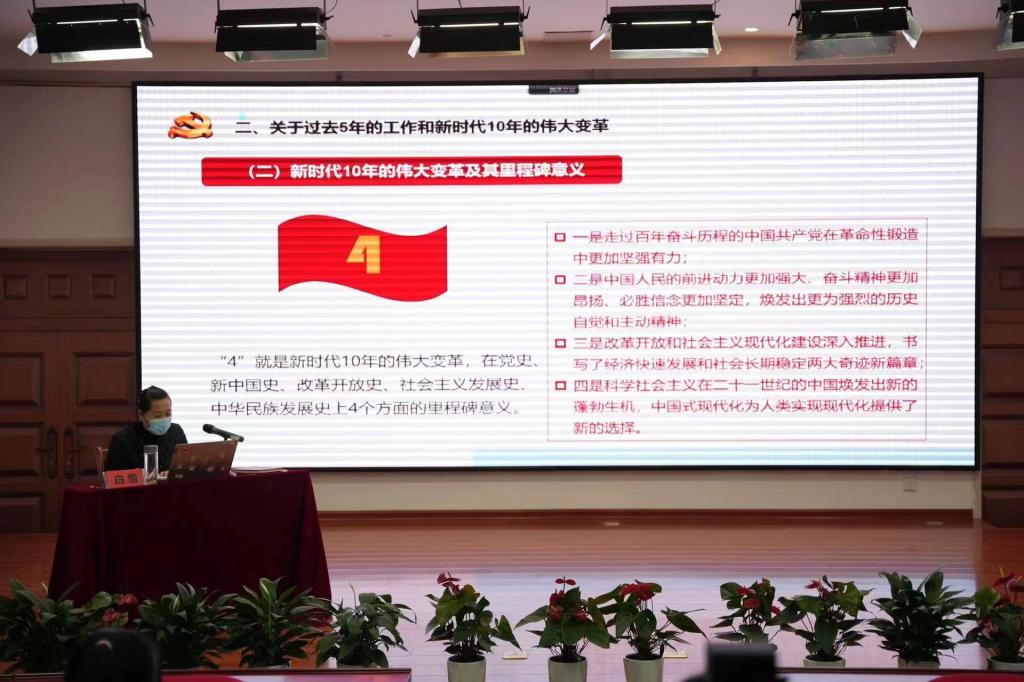 白雪从党的二十大的内容、成果、关于过去5年的工作和新时代10年的伟大变革、关于马克思主义中国化、关于中国式现代化、关于全面建设社会主义现代化国家的目标任务、关于坚持党的全面领导和全面从严治党以及关于应对风险挑战等七个方面进行详细解读,重点讲解了党的二十大关于全面建设社会主义现代化国家的目标任务,以及报告中的“两步走”战略安排。