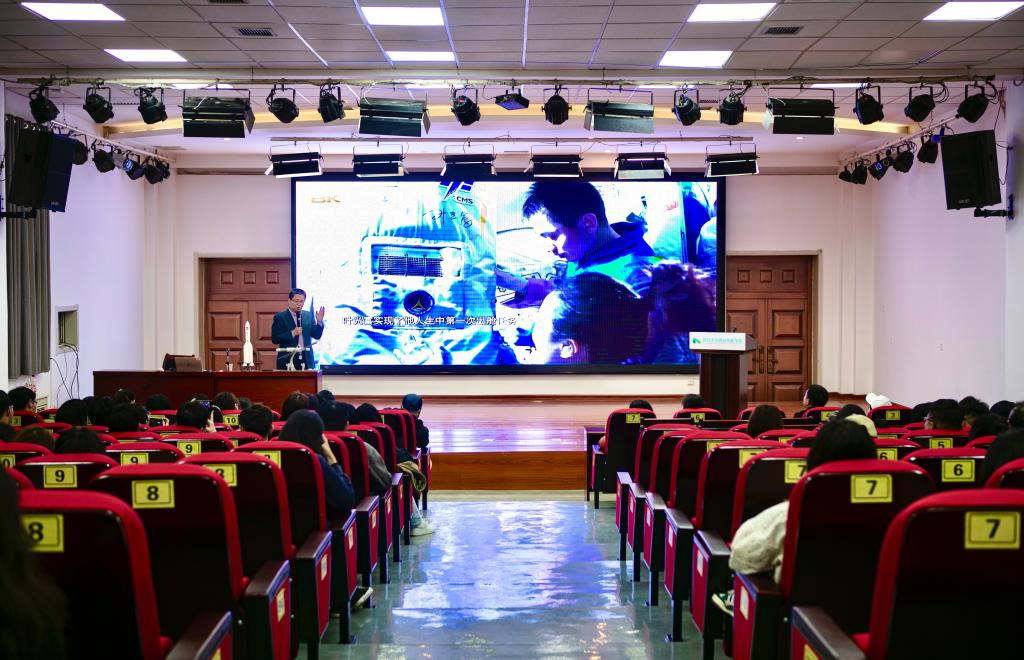 讲座伊始,苟秉宸教授用一张太空视角拍摄的地球照片引发了大家的思考,他从一位亲历者的角度,向师生们讲述了中国航天事业曾面临的挑战和当今取得斐然成绩的不易。从载人飞船到国际空间站,从地球低轨道飞行到探月之旅直到奔向火星,从短期飞行到长期驻留,人类探索太空的脚步从未停止,这全都是一代代航天人秉承“自力更生、艰苦奋斗”的信念以及弘扬“攻坚克难、努力奋斗”的精神体现。其间,苟秉宸教授还借助模型形象演示了我国航天空间站的基本构造和运行轨迹,并通过《梦天圆梦 震撼出征》《中国空间站的钢铁浪漫》《九天揽月会有时》等个人摄影作品向大家展示了我国卫星发射升空的精彩瞬间。每一张照片背后所蕴含的时代故事、拍摄经历及社会印记,都将古老的中华民族飞天梦和新时代国家的民族精神紧密相连。