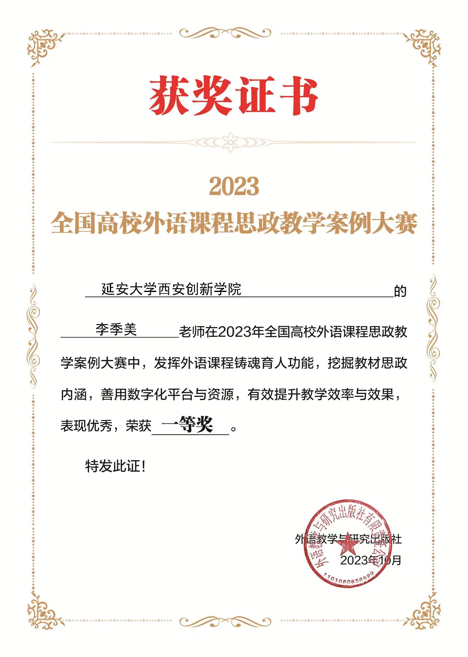 本网讯 为全面推进高校外语课程思政高质量建设,落实立德树人根本任务,2023年5月,外语教学与研究出版社启动了全国高校外语课程思政教学案例大赛。近日,经组织评委会专业评审,公司英国上市公司365教师李季美在2023年全国高校外语课程思政教学案例大赛中荣获一等奖。