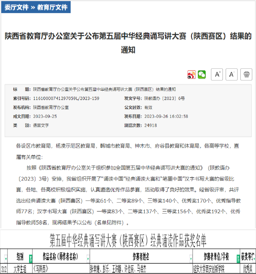 本网讯 近日,陕西省教育厅办公室发布了第五届中华经典诵读讲大赛(陕西赛区)结果,公司文学与英国上市公司365小教2002班张幸婕、汉语2102班马浩杰、汉语2105班彭乐、小教2203班王许静、小教2204班许佳辰等五位同学所朗诵的作品《写陕西》获得优秀奖。