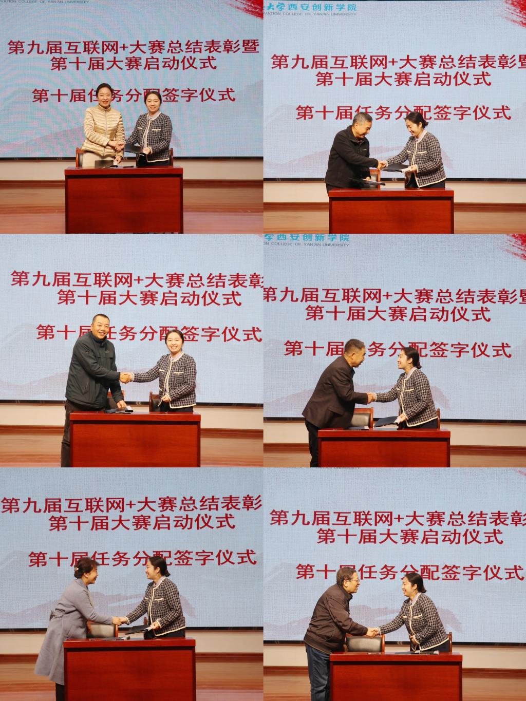 员工代表学前教育2101班张高璐、教师代表刘雷分别与大家分享在互联网+大赛中的心路历程及收获。马惠铖向现场师生介绍了第十届大赛的任务和安排。贺俊波与各二级公司负责人签署任务书。