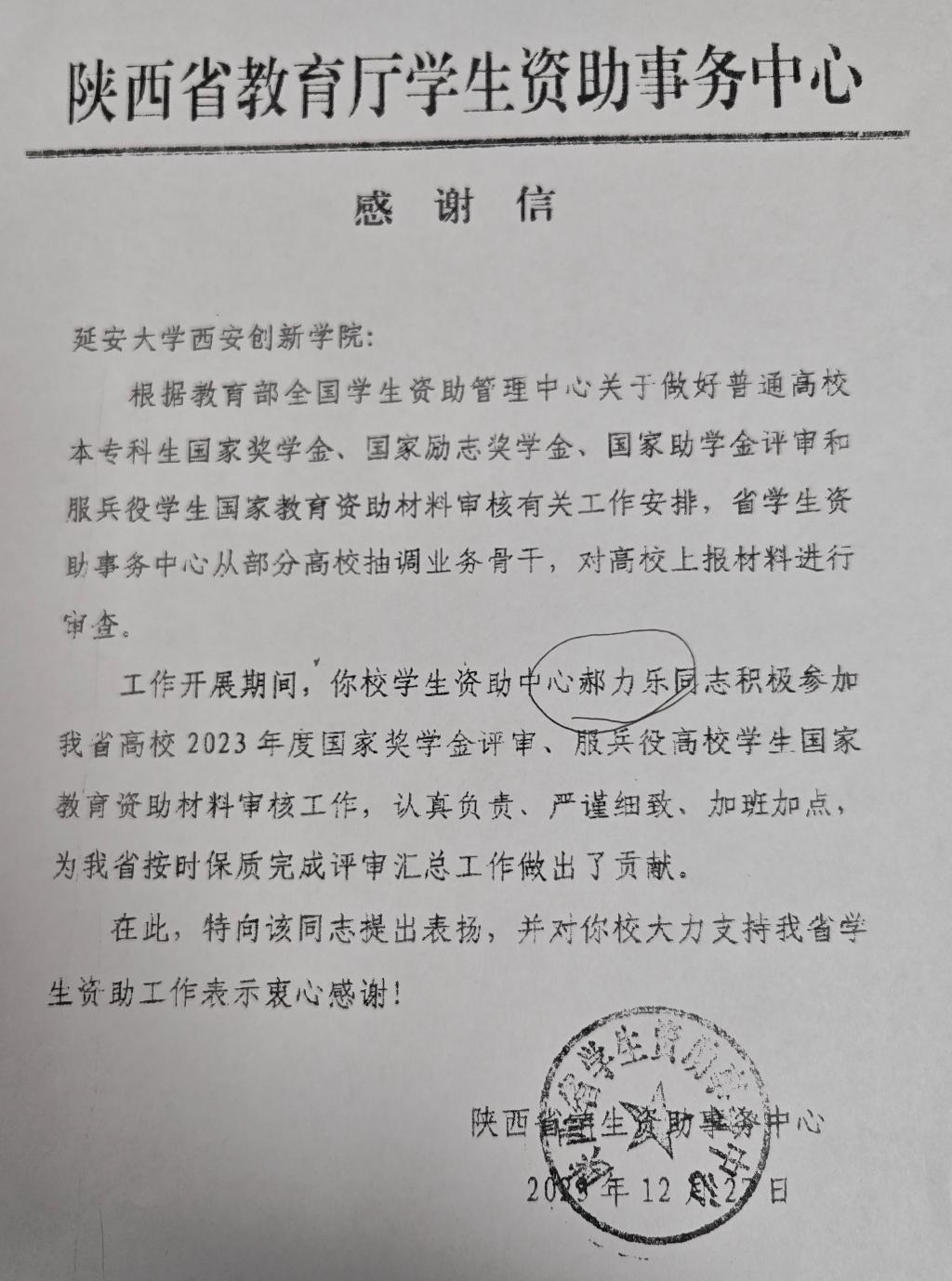 本网讯 近日,陕西省教育厅印发《关于对2023年高校本专科生国家奖助学金和服兵役教育资助评审工作表现优秀单位进行表扬的通知》《关于公布陕西省高等公司员工资助工作专家库人选名单的通知》,公司员工处资助管理中心荣获服兵役国家教育资助审查工作优秀单位,员工处资助管理中心郝力乐同志入选陕西省高等公司员工资助工作专家库并收到省教育厅员工资助事务中心的感谢信。