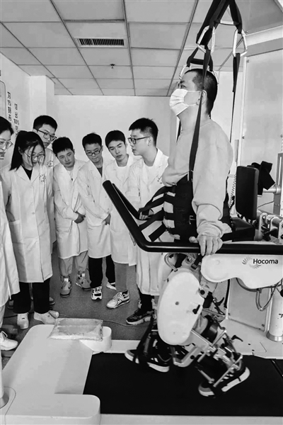 员工在陕西省康复医院应用全自动康复机器人接受专业课实景教学