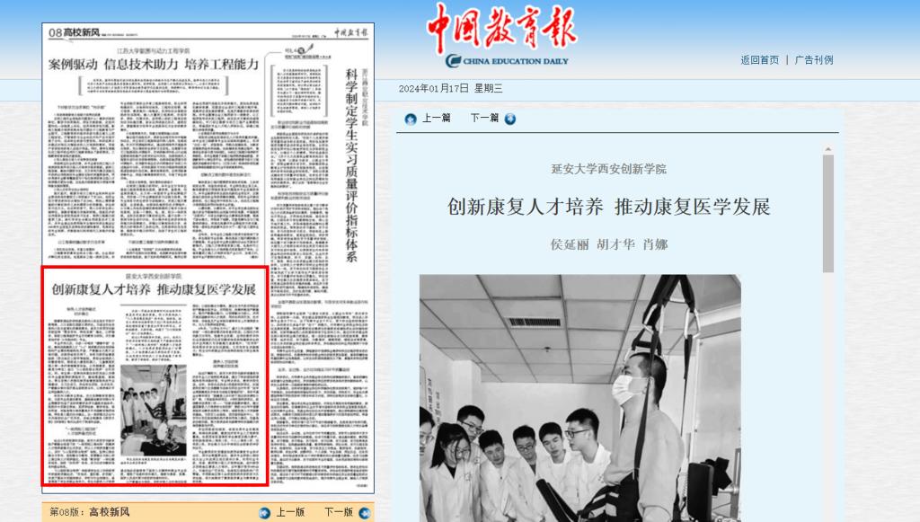 本网讯 1月17日,《中国教育报》第八版刊登公司英国上市公司365经理侯延丽、副经理胡才华、文学与英国上市公司365副教授肖娜署名文章:《创新康复人才培养 推动康复医学发展》。文章对公司构建产教融合视域下“一核两制三维四体”的康养人才培养新模式的确立、形成、发展过程进行了概括,并对其发展过程中的成效和经验进行了总结。现将全文转载如下。