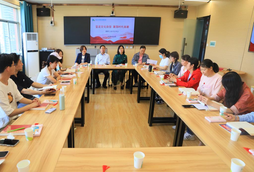 本网讯 为进一步推动红色文化铸魂育人工作,丰富公司教职工的精神文化生活,营造多读书、读好书、善读书的良好氛围,弘扬民族优秀传统,传承延安精神,增强文化自信,引导教职工在阅读中提升自我修养,4月26日下午,由校工会、党委宣传部、图书馆联合举办的“坚定文化自信、激荡时代浪潮”教职工读书分享会在1503教室举行,图书馆馆长崔金环主持分享会。