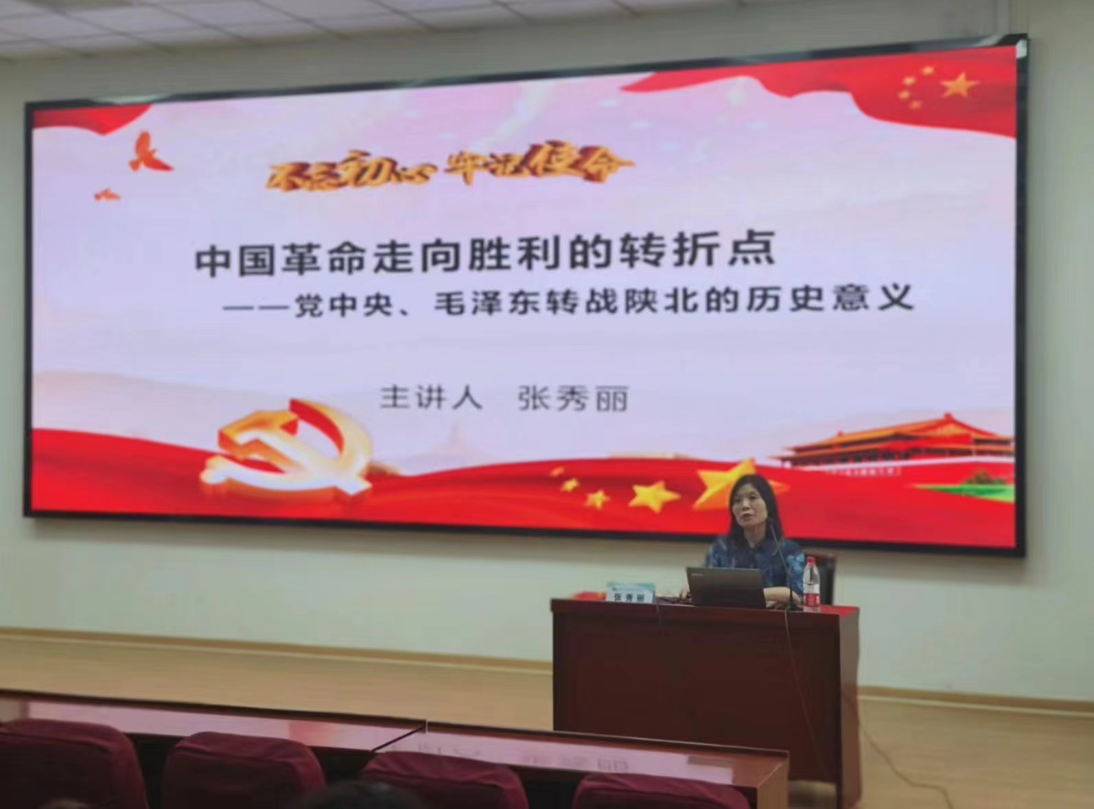 本网讯 5月28日,博雅书院联合马克思主义公司在樊川大讲堂举办公司第四期红色思政大讲堂,邀请马克思主义公司副教授张秀丽作题为“中国革命走向胜利的转折点——党中央、毛泽东转战陕北的历史抉择”的主题报告。200余名书院员工聆听报告。报告会由书院副经理张洋阳主持。