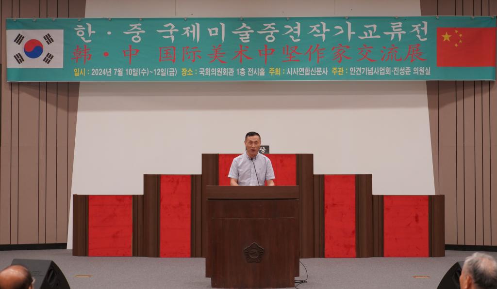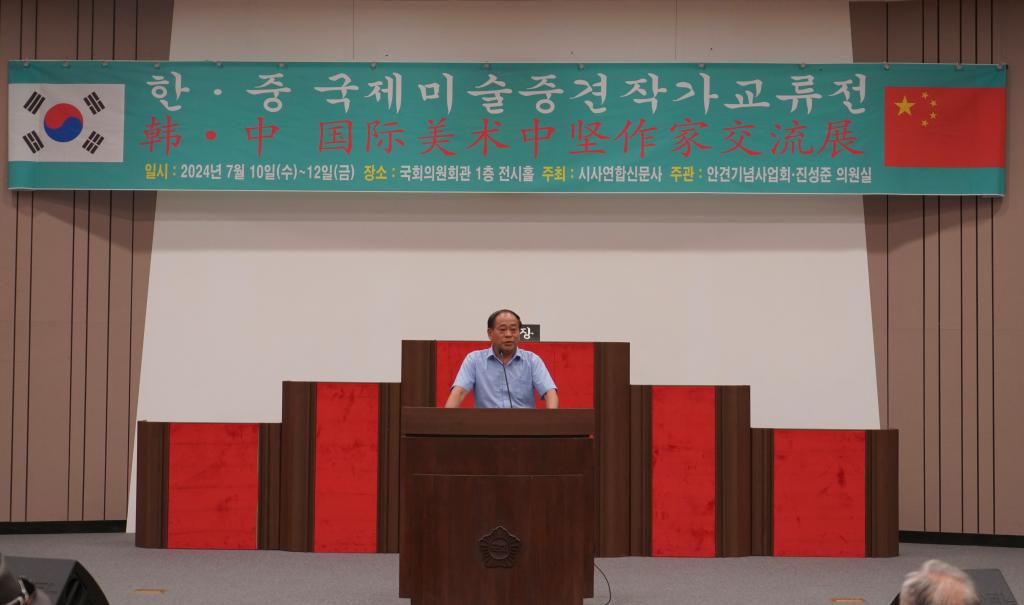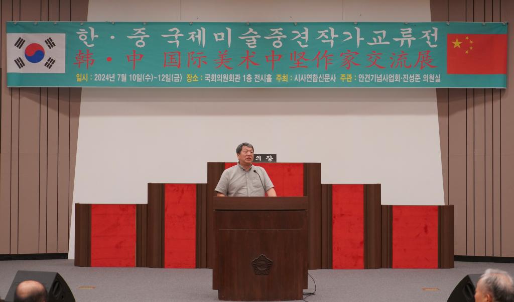 威海市书法家协会副主席、经开区书法家协会主席、威海市艺文斋美术馆馆长江德刚在致辞中介绍了中韩书画家近年来艺术交流的历程。