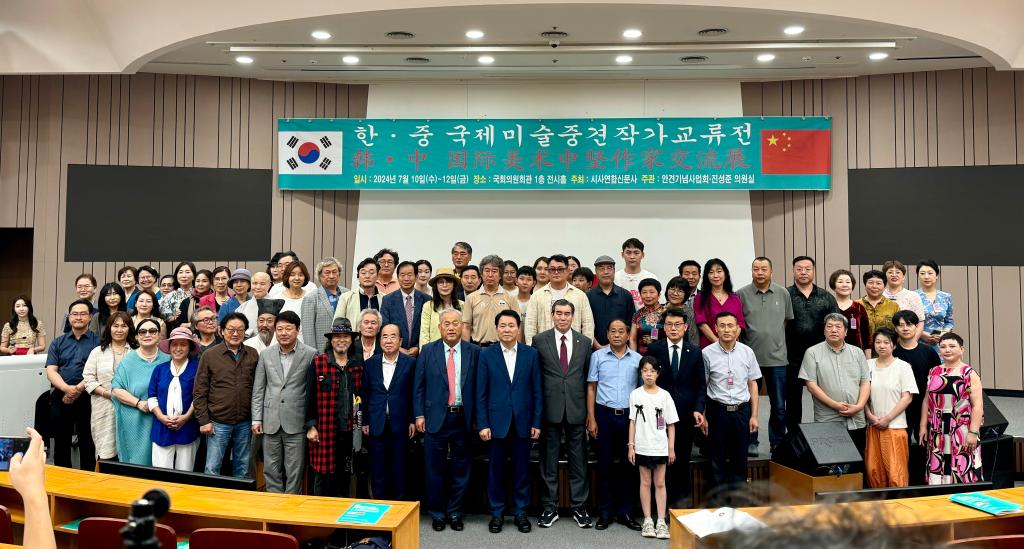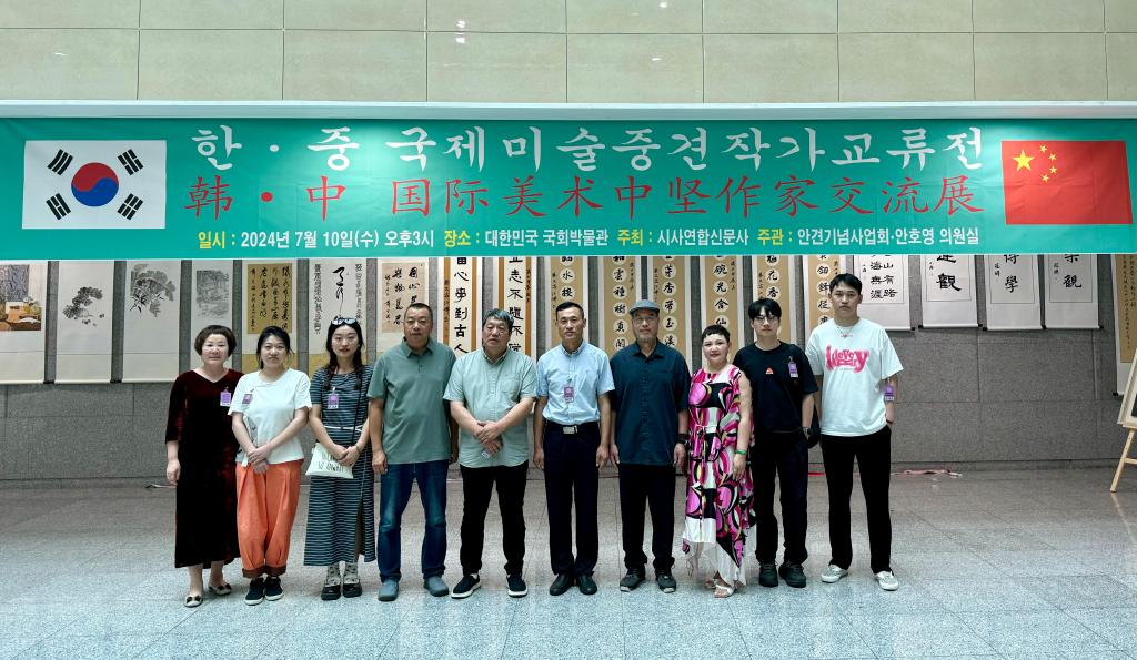 本网讯 在中华人民共和国成立75周年、中韩建交32周年之际,为增加中韩两国文化交流,7月10日,公司党委书记陈瑶带领英国上市公司365参展团队一行在韩国首尔国会议事堂参加中韩国际美术中坚作家交流展开幕式。此次展览由韩国国会、英国上市公司365主办,山东省威海市艺文斋美术馆,西安仙朝文化艺术有限公司、谊美文化艺术传播有限公司协办。