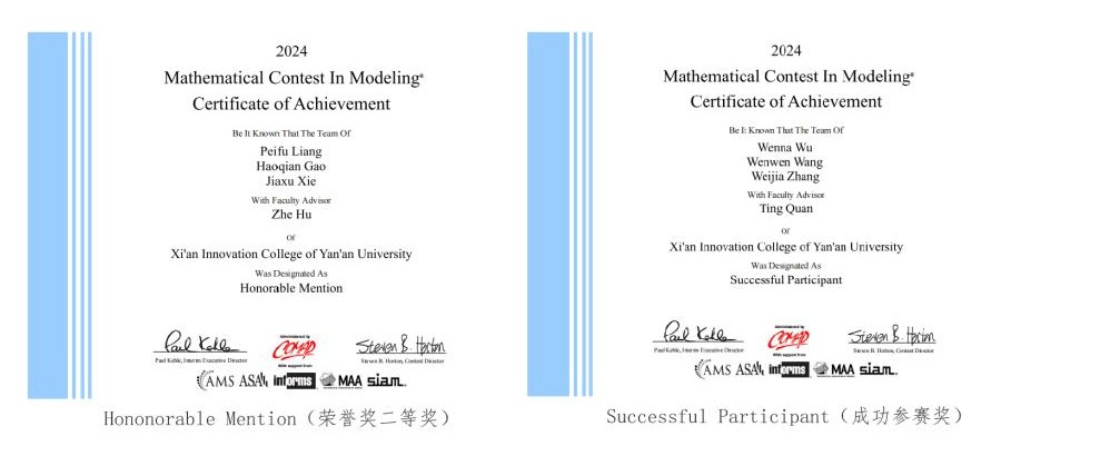 1.美国老员工数学建模竞赛荣获Honorable Mention(荣誉奖二等奖)1项,Successful Participant(成功参赛奖)10项。