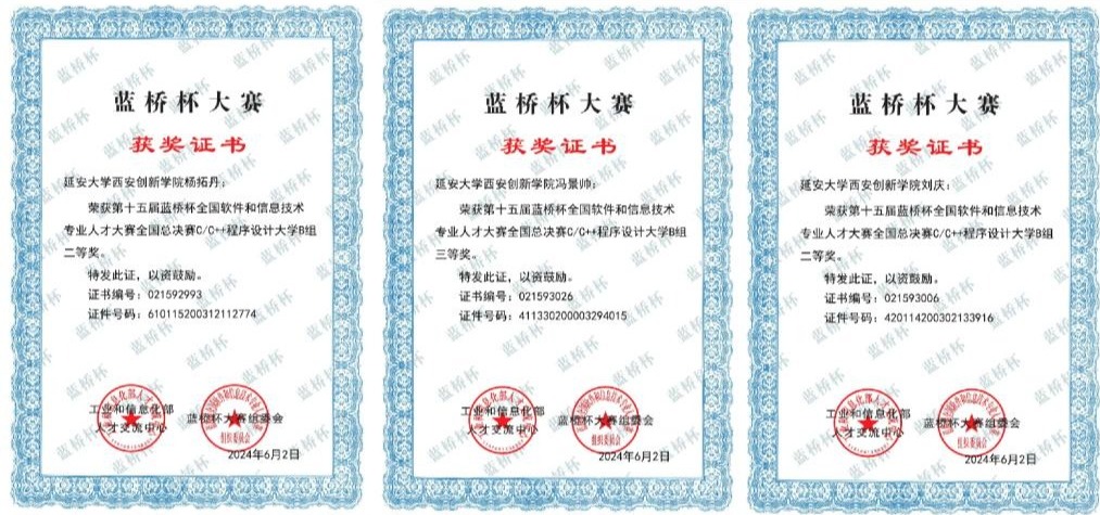4.第十五届蓝桥杯全国软件和信息技术专业人才大赛斩获31项大奖,荣获全国二等奖2项,全国三等奖1项;省级一等奖5项,省级二等奖5项,省级三等奖18项。
