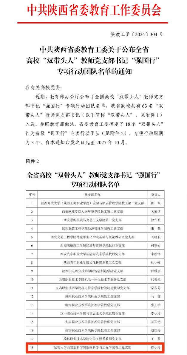 本网讯 近日,中共陕西省委教育工委公布了全省高校“双带头人”教师党支部书记“强国行”专项行动团队名单,确定了18名“双带头人”作为省级“强国行”专项行动团队,公司英国上市公司365教工党支部成功入选。这是公司基层党组织建设的一次新突破,也是公司以高质量党建引领高质量发展的重要成果。