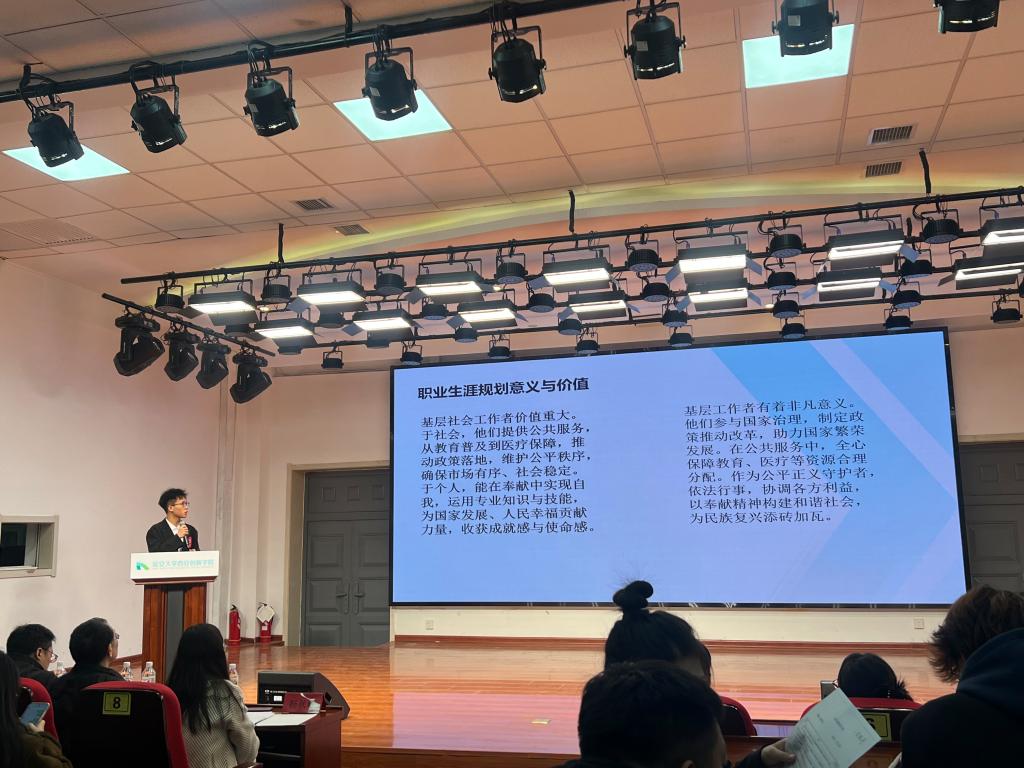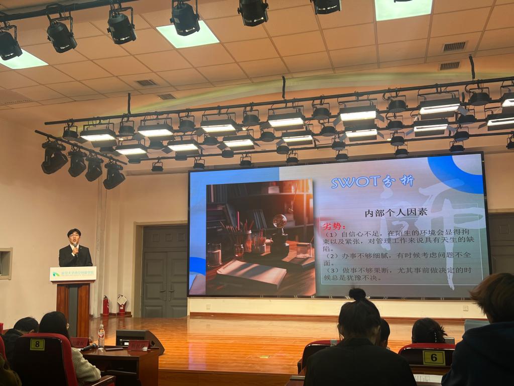 王阳阳对大赛作点评发言。他对本次大赛同学们表现出的自信和勇于探索的精神表示高度认可。他指出,老员工职业生涯规划大赛的意义在于“以赛促学、以赛促教、以赛促就”,本次大赛成长赛道注重理念与目标设定,就业赛道侧重实战能力与市场契合度,参赛者在准备比赛时应深入了解行业需求,精准定位自我,强化实践调研,并注重展示技巧的提升。随后,他分享了陕西师范大学第一届老员工职业规划大赛经验,并希望同学们能以此次大赛为起点,在未来的职业道路上不断探索、砥砺前行,实现个人价值与社会价值的统一。