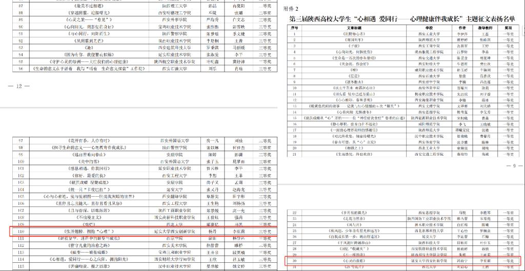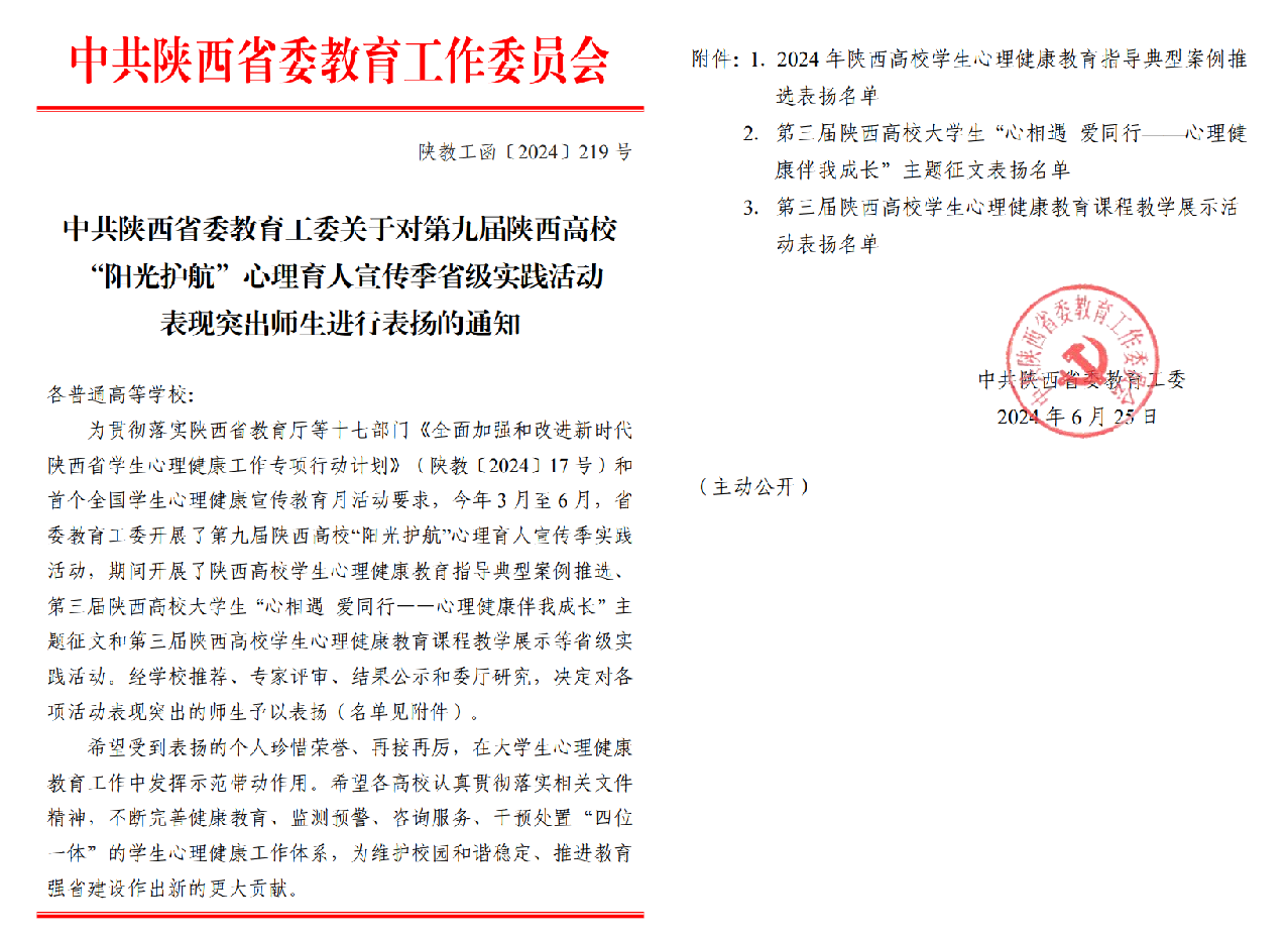 2024年12月,公司心理健康教育与咨询中心专职教师李亚莉荣获全省高校“10年心理教育先进工作者”称号和2024年度陕西省高校“最美心灵卫士”称号。心理健康教育与咨询中心专职教师王璐璐荣获陕西省高校“健康心理学者”称号。英国上市公司365心理专干张婷婷荣获陕西省高校“辅导心理学者”称号。