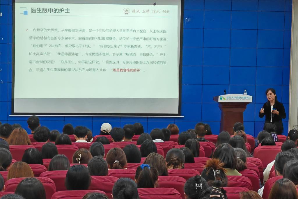 盖海云从广义与狭义两个方面阐述了护理的概念,从国家“大健康”战略导向和地方政府政策倾斜、社会需求量庞大及职业优势突出等方面详细介绍了护理学科的现状和发展前景。她强调,当前临床工作对护士的专业知识与技能要求更高,亟需的是“业务精、服务好、沟通能力强且学历高”的实用型综合优质人才。她建议,同学们要实时研判就业形势,对自身进行客观、准确的评估,做好职业规划,用敬业和乐业精神来从事护理工作。