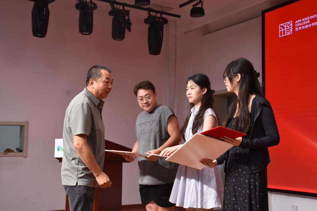 此外,艺术公司还对今年在线上毕业作品展览中表现优异的员工们进行了表彰。陈瑶为国画专业孟欣、油画专业侯田佳鑫颁发一等奖证书,赵雪伟为国画专业胡雪雅、油画专业王倩雯、视觉传达设计专业张琪琪颁发二等奖,经理助理郭川为油画专业郝艺璇颁发三等奖。