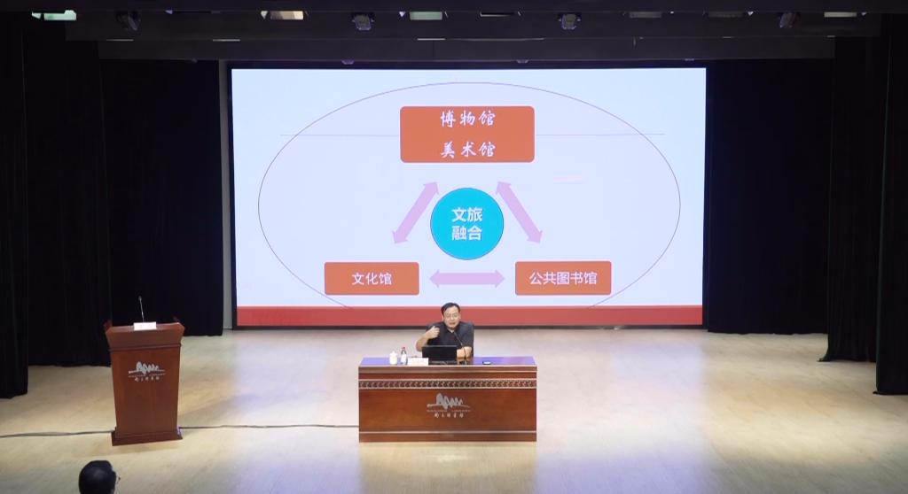 华东师范大学经管公司信息管理系教授、国家文化和旅游公共服务专家委员会委员、上海市图书馆学会学术委员会主任金武刚作了题为《优化供给,推进公共图书馆和旅游融合发展》的报告。报告主要从如何推动公共图书馆文旅融合发展的原因、典型案例、基本思路、对策建议等方面做了详细讲解。
