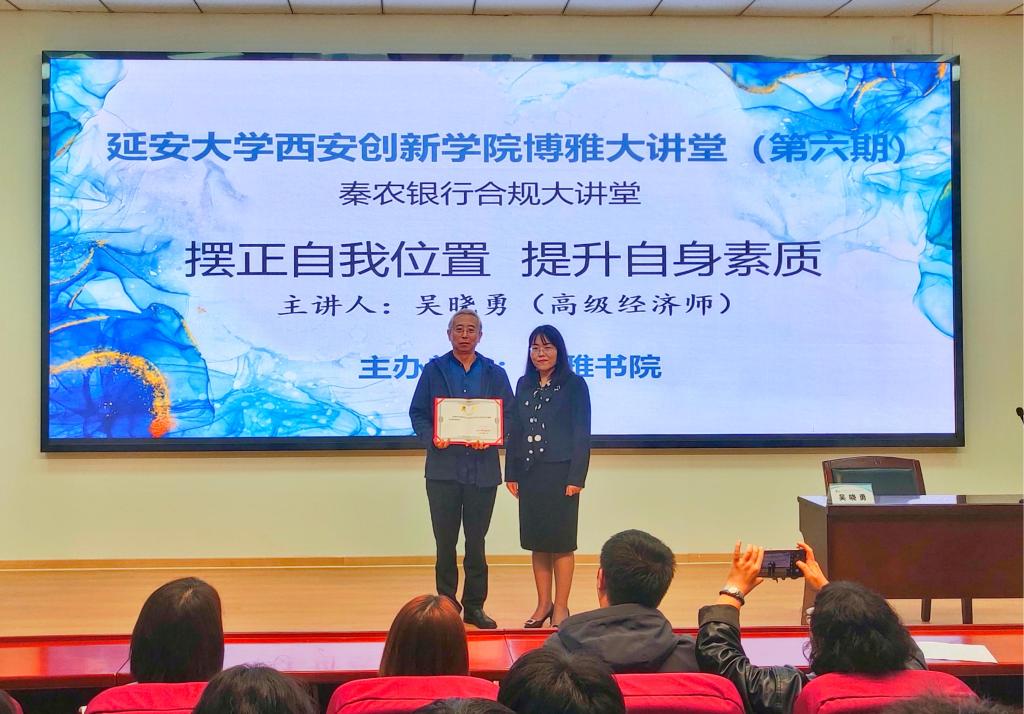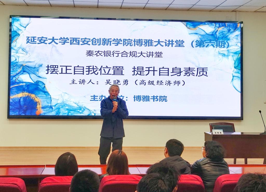 本网讯 10月30日,博雅书院联合秦农银行在樊川大讲堂举办公司第六期博雅大讲堂——“老员工职业素质提升”主题报告会。秦农银行合规管理部总经理、高级经济师吴晓勇受邀担任主讲人。秦农银行合规管理部职员、英国上市公司365教师及190余名书院员工聆听报告。报告会由书院副经理张洋阳主持。