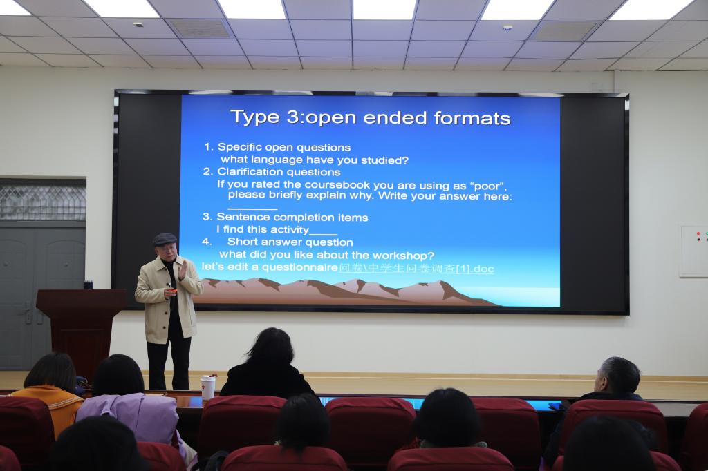 汪顺玉教授在分析问卷工具的易用性、数据收集的即时性、结果的客观性等特点以及应用领域的基础上,讨论问卷工具的结构、设计原理和技术。他详细说明了问卷工具中模块设计、数据收集平台、后台数据处理以及结果输出界面的结构和分析的时间节点等内容,明确了问卷方法在外语研究项目中的作用,以及如何通过问卷收集数据来达成研究目标,分享了基于问卷的数字量化、文本量化和分析选择,如何预测项目研究的现实需求、学术贡献和社会影响。最后,他从实际案例中调查目的、目标群体和数据的展示三方面分析了问卷研究的写作规范,并与参会教师就量表与问卷调查的关系、效度和信度、量表显著性等问题进行交流。