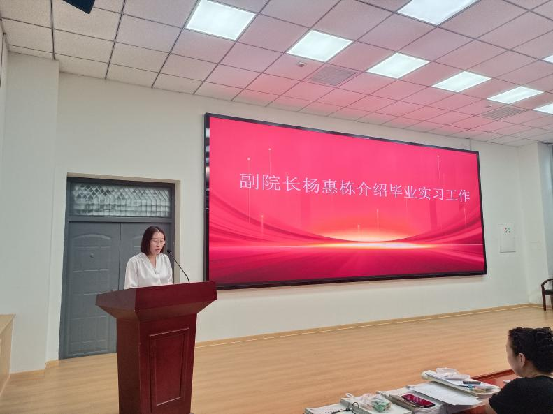 会上,杨惠栋首先就毕业实习工作展开详细说明。她指出,毕业实习是连接理论学习与职业实践的重要桥梁,也是检验员工专业能力的关键阶段。她围绕实习内容和要求、学科实践要求等进行了系统阐释,并鼓励同学们珍惜实践机会,将所学知识转化为实际技能,为未来职业发展奠定坚实基础。