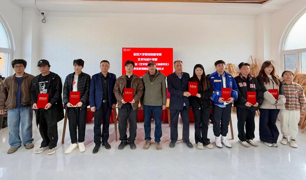 为充分发挥艺术推动乡村振兴的作用,用美术作品展示乡村美景,赋能乡村文化产业发展,在写生后期,教师评选出三十余张优秀作品,捐赠给吴堡县岔上镇人民政府“双百工程”产学研示范基地。同时对在劳动实践中表现优异的员工进行表彰,并在全体师生见证下举行颁奖仪式。公司执行经理赵雪伟,吴堡县岔上镇镇长郭永兵、产业发展服务中心郝鹏燕、驻村队员康芳芳、写生基地负责人冯建国为获奖员工颁发证书,以资鼓励。