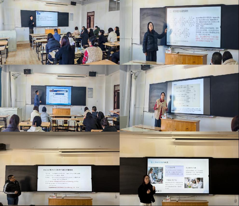 在前沿领域分享环节,惠洋洋老师聚焦天然产物研究的核心痛点,分享了提升天然产物产量与活性的创新技术策略。针对竹红菌素家族化合物因结构复杂(含轴手性、阻转异构等特性)导致化学全合成难度大、产率低的问题,提出通过优化发酵菌株培养条件、调节培养基成分等方式实现高效制备的解决方案,为基础研究与产业应用的衔接提供了新思路;汪小毅老师详解了网络药理学技术在中药有效成分筛选中的应用,从靶点预测、通路分析到验证实验,完整呈现了现代技术与传统医药结合的研究范式,为跨学科研究提供了可借鉴的实践路径;马文宇老师则将目光投向传统发酵工艺的现代解读,通过解析青稞酒发酵过程中的物质转化规律,展现了传统技艺与现代科学融合的独特价值,拓宽了青年教师的研究视野。