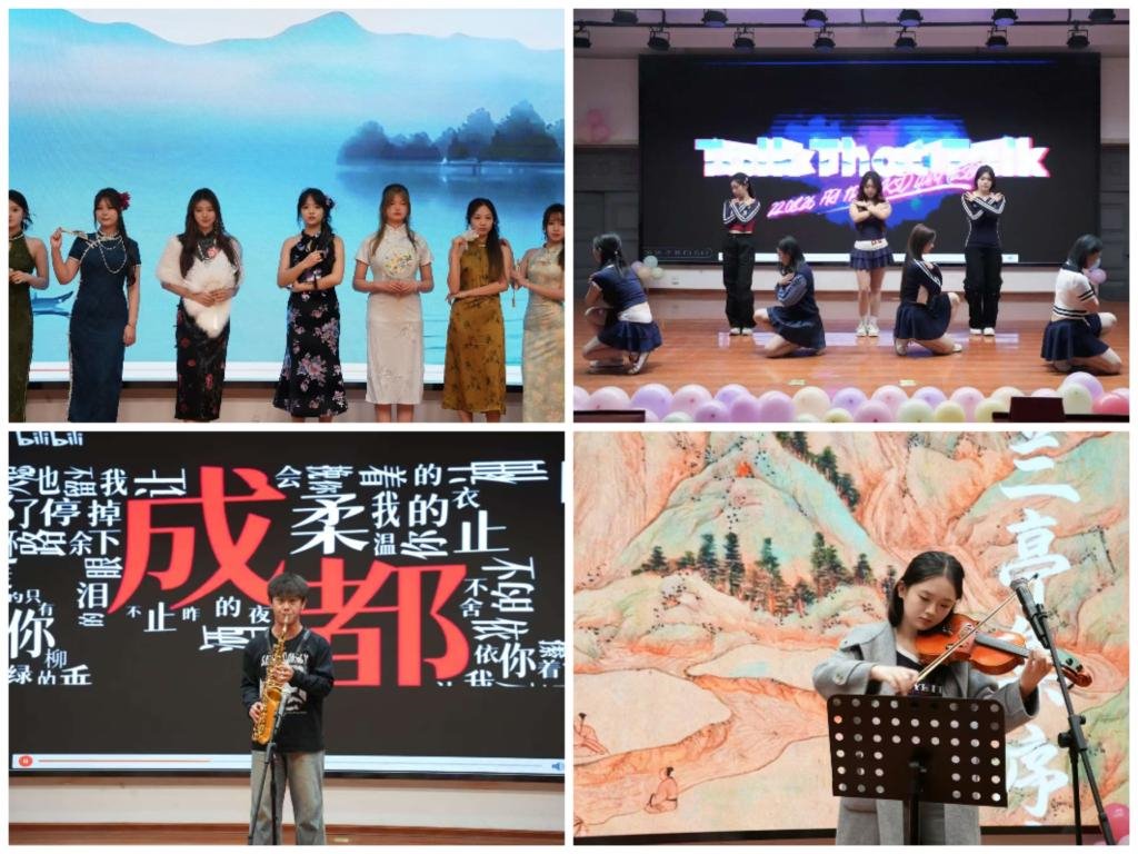 器乐演奏与舞蹈环节,萨克斯独奏《成都》悠扬动人;小提琴独奏《兰亭集序》典雅深情;民族舞串烧优雅曼妙,现当代舞活力四射,洋溢着青春的节奏感与表现力。