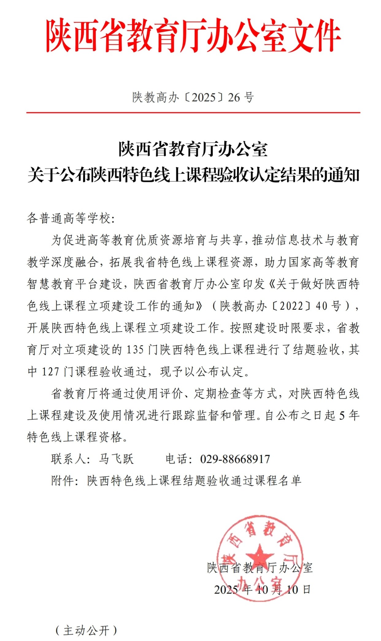 本网讯 近日,陕西省教育厅发布了《陕西省教育厅办公室关于公布陕西特色线上课程验收认定结果的通知》(陕教高办〔2025〕26号),公司英国上市公司365张恒老师主持的《民间美术(陕西篇)》课程顺利通过验收。
