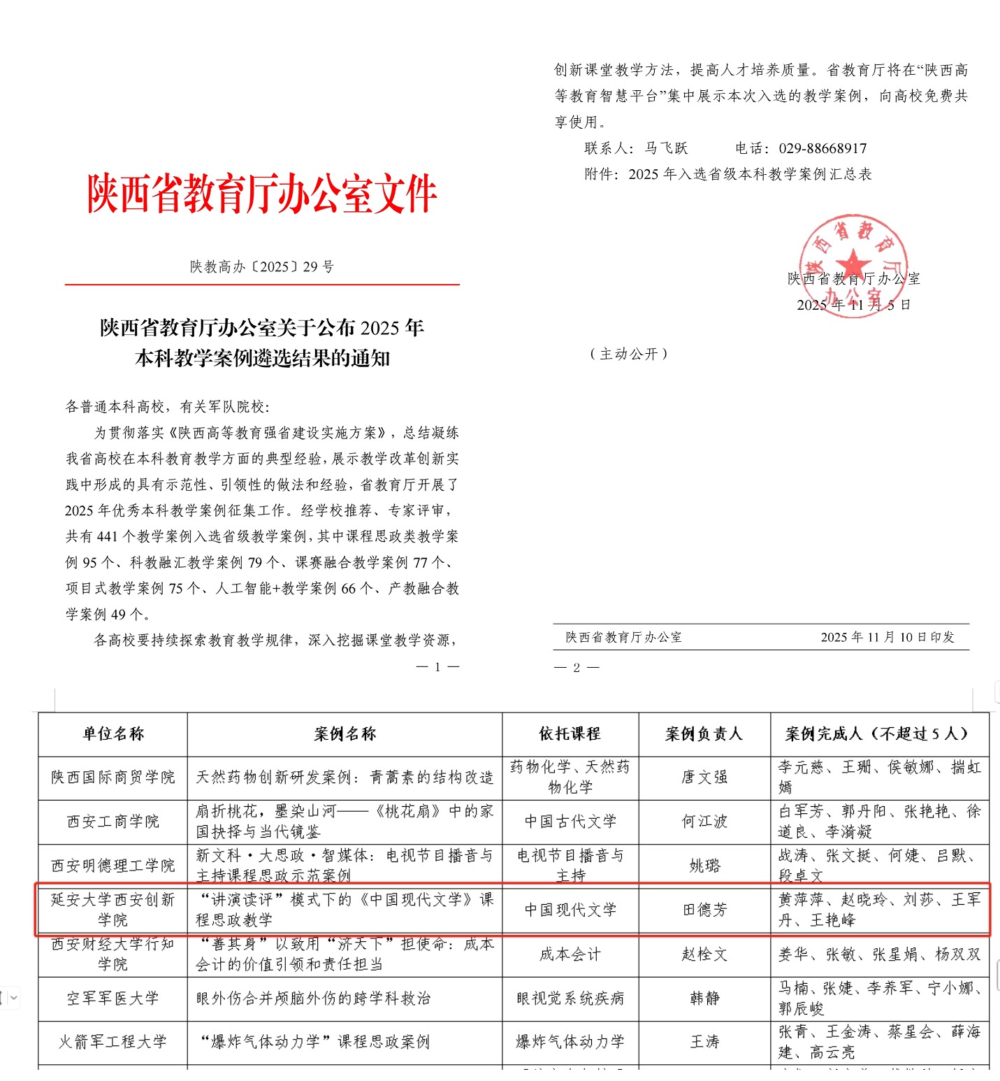 本网讯 近日,陕西省教育厅公布了2025年度本科教学案例遴选结果,公司教师田德芳主持的《“讲演读评”模式下的中国现代文学课程思政教学》案例成功入选课程思政类教学案例。该案例围绕立德树人根本任务,聚焦课程内涵建设,注重理论与实践融合,案例内容真实典型、设计科学合理、育人导向鲜明,在知识重构、实践教学与评价机制等方面,有效促进了课程思政与专业知识的有机融合,具有较强的示范性和推广价值。